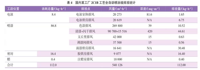 為了明確油漆車間各工藝環節的實際排放情況,本文就國內某工廠2C1B工藝全自動噴涂線的實際情況做了以下實測統計。