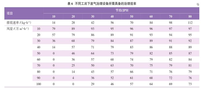 由表6可見,當產量較低、排風量較大時(表6左下角區域),幾乎不需要治理排放也能達標(治理效率要求0%);當產量較高、排風量較小時(表6右上角區域),治理難度極大(治理效率要求>95%)。
