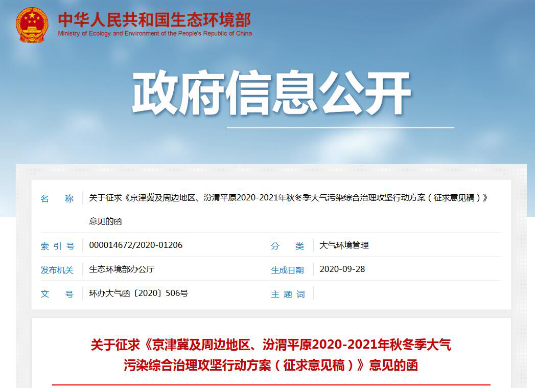 日前,生態環境部發布《京津冀及周邊地區、汾渭平原2020-2021年秋冬季大氣污染綜合治理攻堅行動方案(征求意見稿)》。