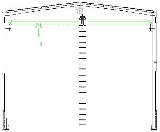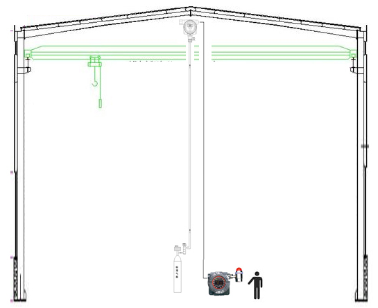 針對輕于空氣的可燃有毒氣體的檢測,一般會在廠房最高處易于聚集氣體的位置安裝氣體檢測器。氣體檢測器需要定期做校準和維護,此時就涉及到如何維護的問題,傳統的做法是維護人員攜帶工具及標準氣瓶爬梯子上到高處予以維護,危險性大,可操作性差。具體做法如下圖所示。