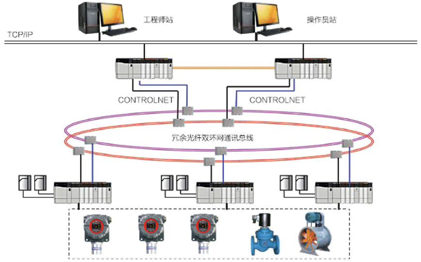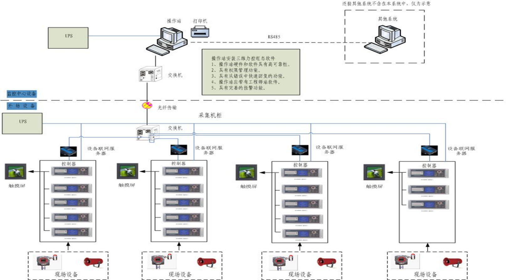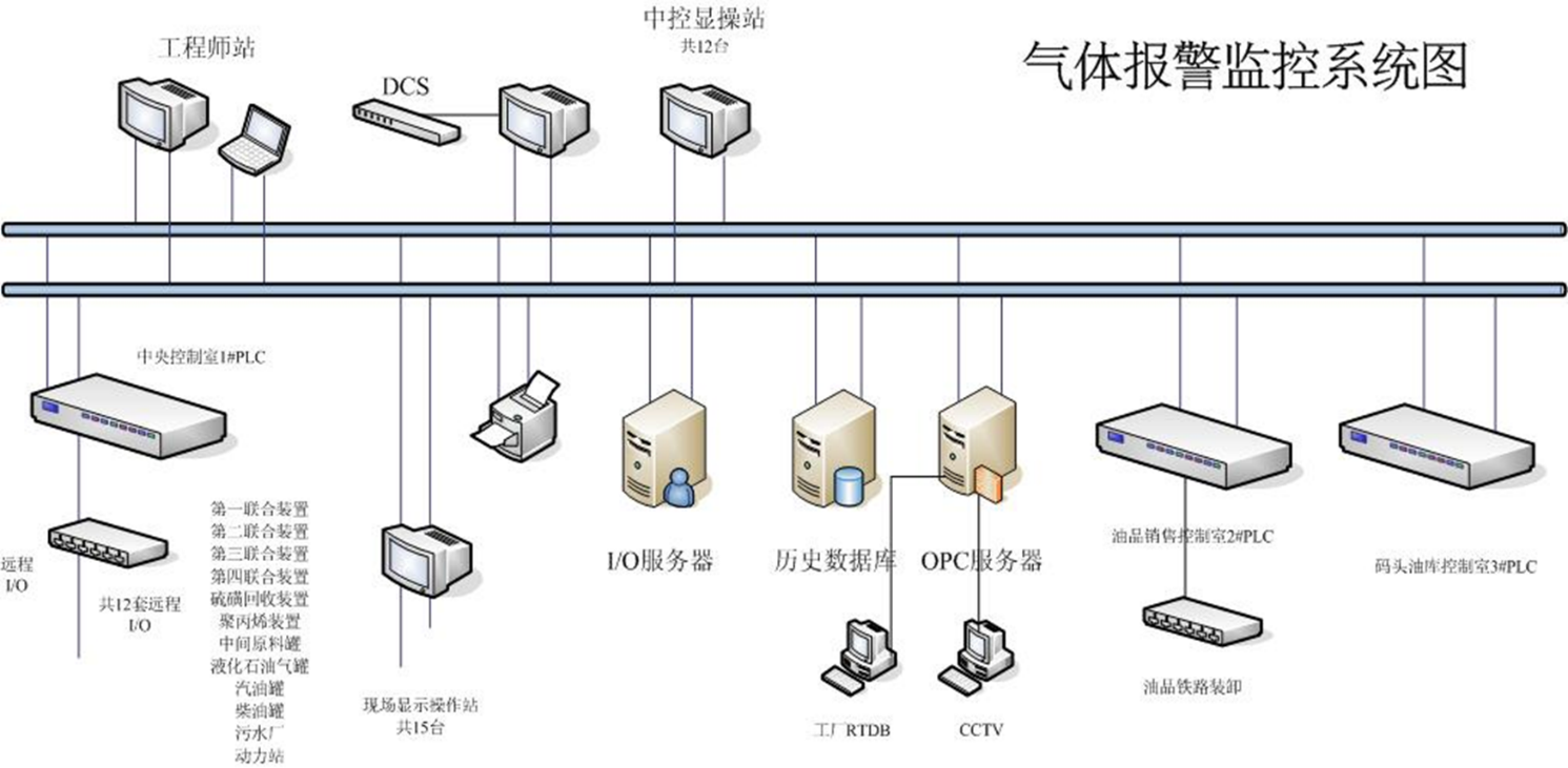 系統由安裝在現場的可燃/有毒氣體探測器和安裝在控制室內的控制單元、數據采集模塊、工作站等組成。通過數據采集模塊對現場檢測器實施數據采集,并通過通訊模件完成于操作員站或第三方系統(設備)之間的通訊,接受相關信息并傳遞實時數據。