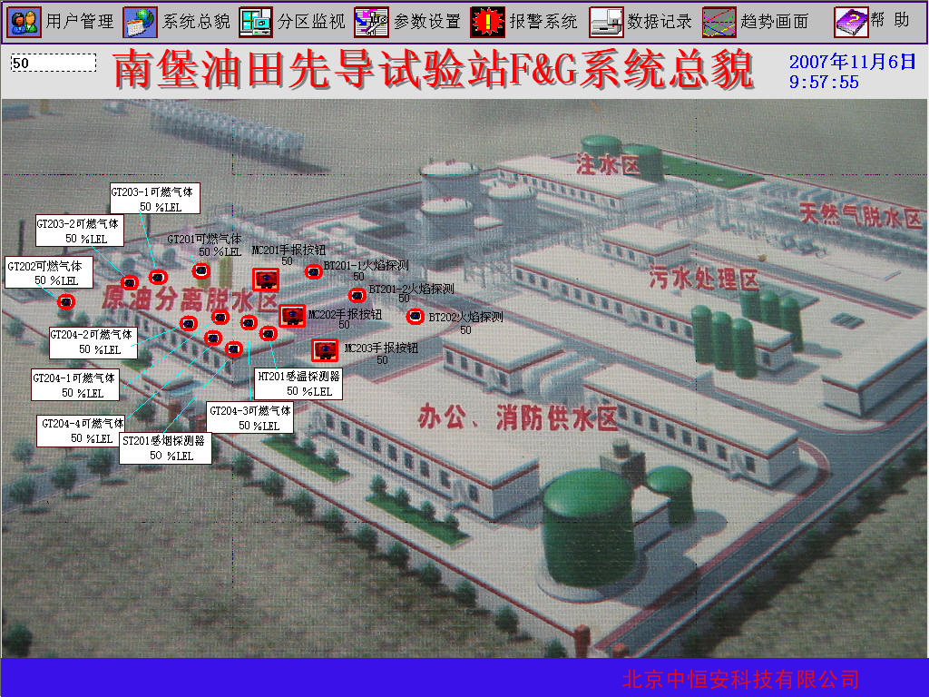 顯示及報警畫面將總貌畫面、分區畫面及單個探測器信息畫面。總貌畫面將包括各個裝置和公用工程部分等,分區畫面為裝置內的探測器位號及布置位置、報警信息等。用鼠標點擊某一分區就可把界面轉入分區顯示狀態。現場任一探測器故障報警時,總貌畫面內對將的裝置將閃爍或自動彈出分區畫面。