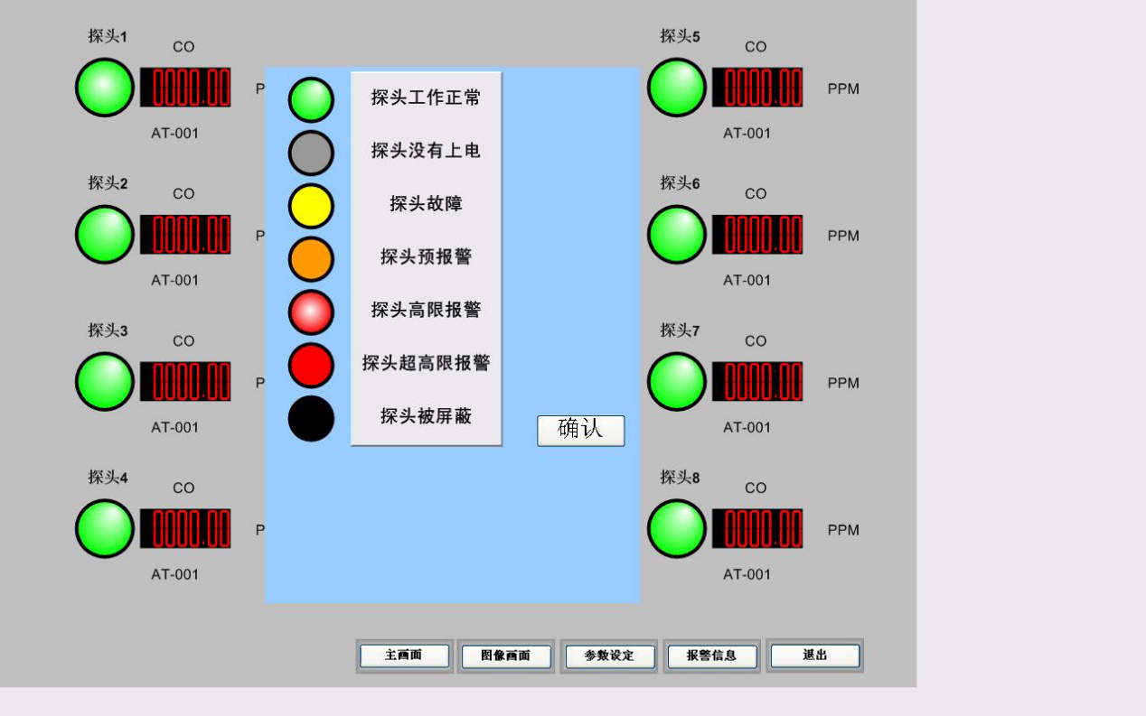 1.1 濃度顯示:控制器系統能顯示現場的被測氣體濃度信度息(單位用戶可選)。每一探頭在控制器系統界面中都有對將的分區域的濃度顯示框,濃度顯示框顯示對將的探測器氣體濃度。